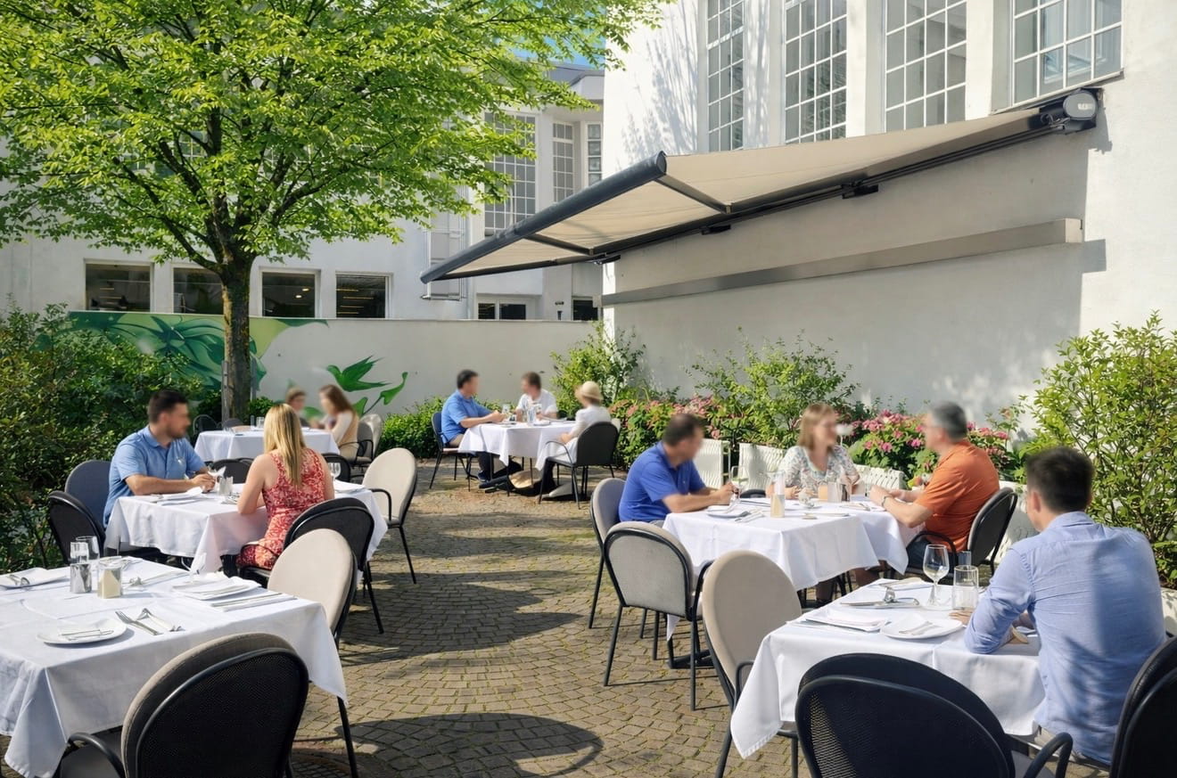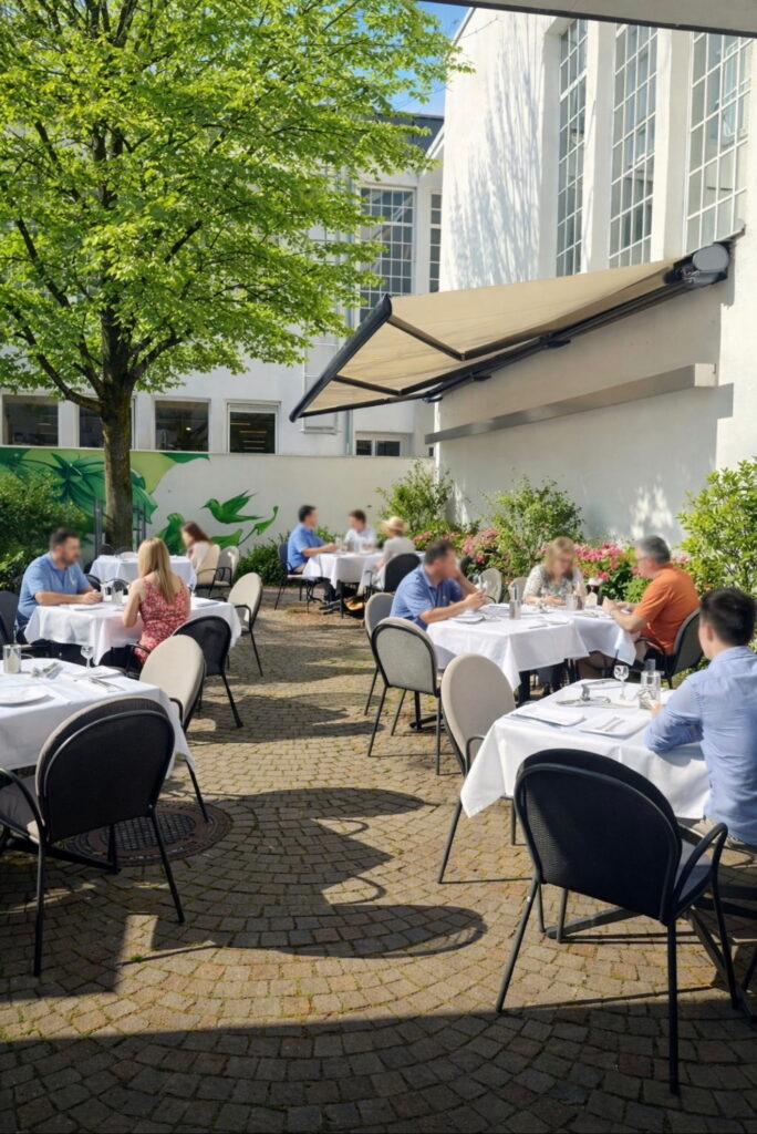 Hier genießen Sie entspanntes Essen im Freien – ob zum Mittagessen, zum Geschäftsessen oder beim stilvollen Abendessen unter freiem Himmel.